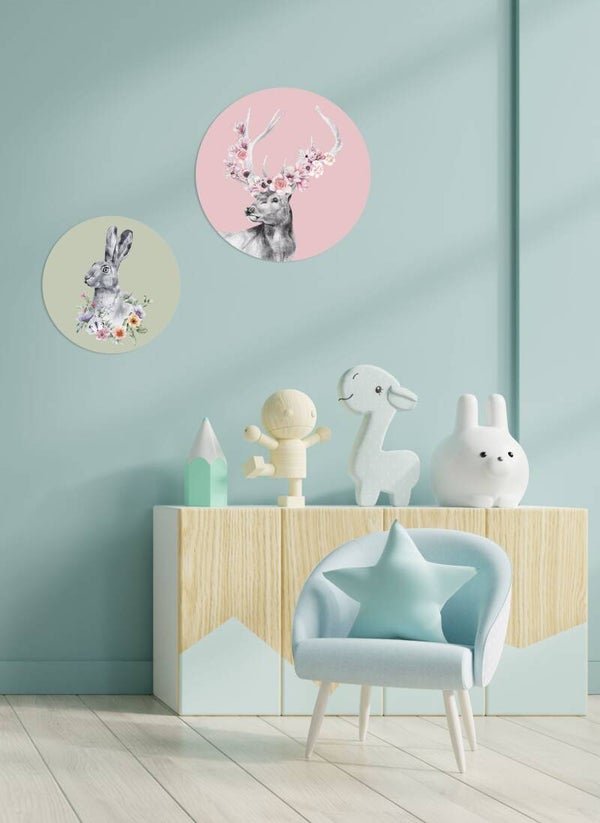 De zachte kleuren maken dat deze wanddecoratie zowel in de kinderkamer of speelhoek, maar ook in de woonkamer een prima plaats kan krijgen. Uiteraard hebben we ervoor gezorgd dat alle 3 de platen uit deze serie mooi met elkaar matchen. Door het hert, het konijn en het paard te combineren creëer je een prachtig geheel. Kijk voor meer inspiratie bij onze inspiratiefoto's!